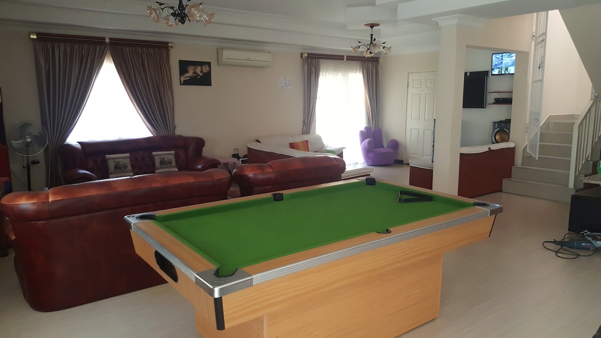 這座位於市中心的大型雙層殖民地別墅坐落在美麗、安靜的郊區花園中,有泛光網球場、遊泳池、蹦牀和健身房,房客可以輕鬆前往任何地方。 斯諾克房間、備有充足的圖書館和酒吧通往寬敞的遮蔽式陽臺,配有燒烤設備。 娛樂和電視休息室。 開放式廚房,通往涼亭和洗衣設施。極佳的安全性,有圍牆花園、電柵欄和充足的私人停車位。
