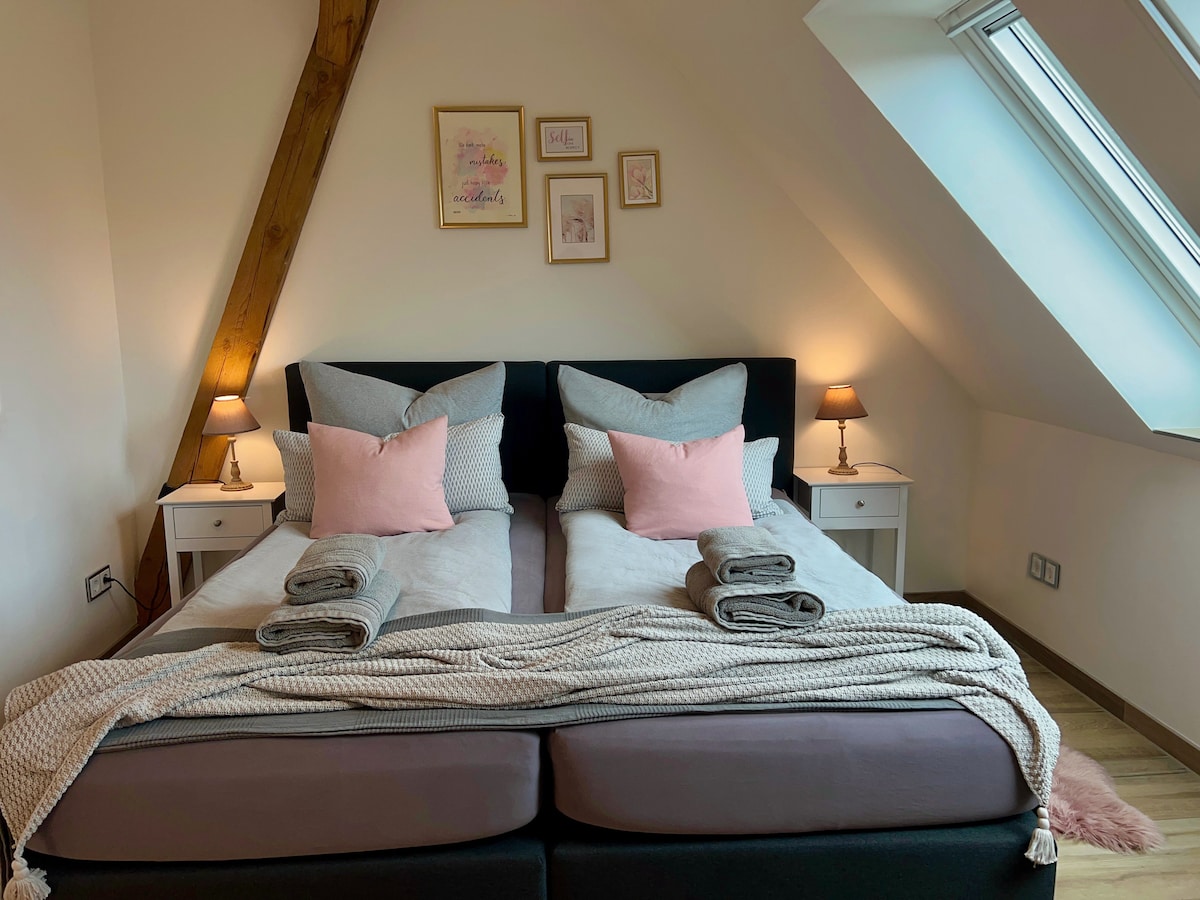 這座歷史悠久的建築是典型的北德農舍,坐落在一個小村莊的邊緣,可以俯瞰起伏的山丘景觀。房子後面的草坪與我們的2公頃大自然地產相連,樹下和溪邊有許多舒適的地方。 我們用天然材料翻新了這座小屋,並配備了舒適的設施,例如壁爐和小型桑拿房。