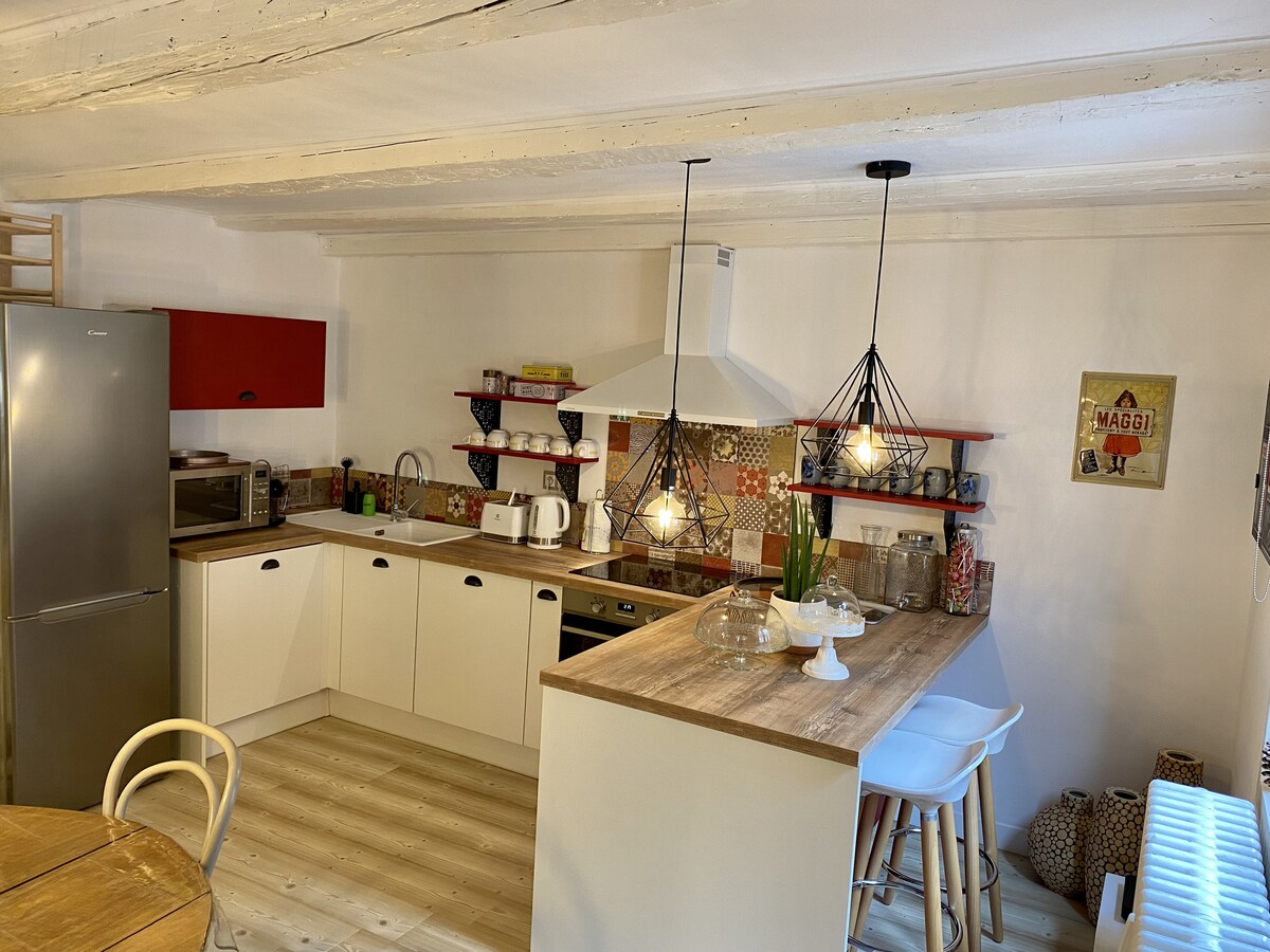 位於奧貝奈市中心的60平方米公寓,位於1592年的阿爾薩斯建築內。 裝飾有品味和設計,舊樑和外露的樑的魅力,一個獨立的浴缸將完成這個舒適的地方。 可應要求提供嬰兒床、嬰兒椅和單車,視乎供應情況而定:)