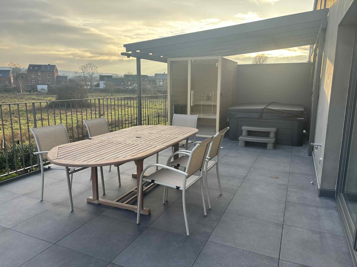 在位於阿登市中心的一個安靜的地方,您可以在寧靜和奢華中入住我們的房源。 我們的Gites以永續的方式建造,採用高品質的天然材料。 我們很高興歡迎您入住我們的住宿,配有加大雙人牀、步入式淋浴間、設備齊全的廚房(洗碗機、Nespresso咖啡機)、空調和柴火爐。 透過我們的戶外桑拿房和按摩浴缸享受您自己的健康,完全私密,可俯瞰阿登山的美景。