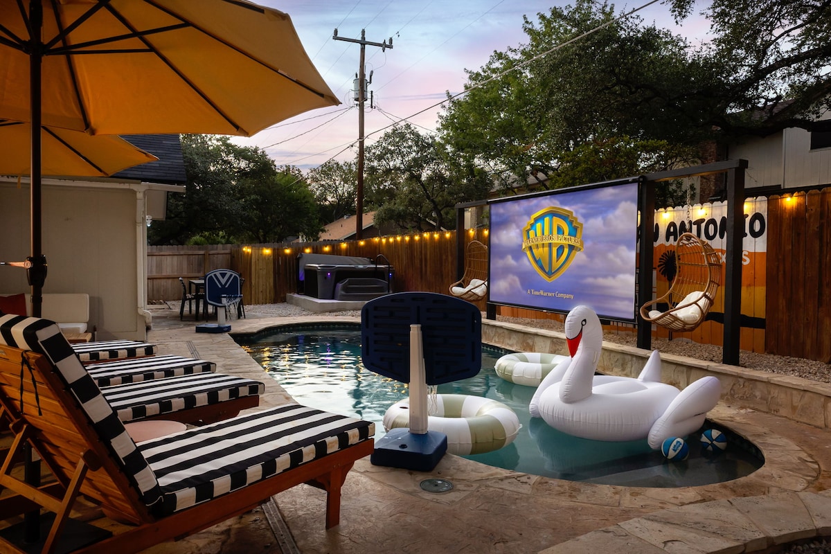 Lots of indoor and outdoor entertainment for the entire family! The theater room is great for movie night, karaoke and gaming! Our spacious home has a theater room with 120-inch projector screen, Xbox Series S, PlayStation 5, Karaoke and Dolby Atmos surround sound. Outside has a wood firepit & propane firepit, and a Heated in-ground pool! The pool is 20x10 and 5 ft deep. We provide plenty of seating to accommodate a large group. The Alamo 5mi, Riverwalk 4mi, Alamodome 6mi, Convention Ctr 5.5mi