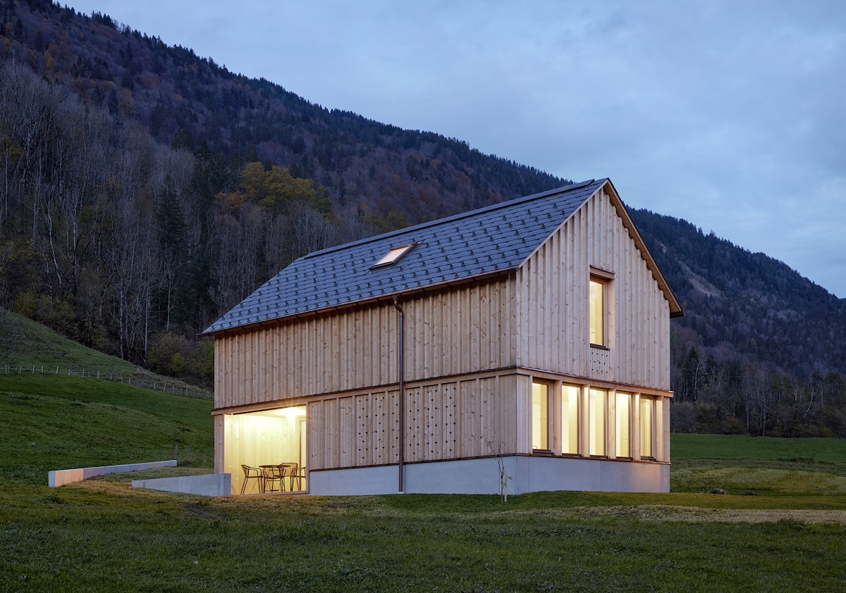 Modern wooden chalet with fantastic view over the whole valley and into the stunning austrian Alps. 3 floors with supercomfy charme, located above Schwarzenberg and a 5 minute drive to the Bödele ski resort. The house is located about 15 / 20 minutes by car from some of the areas finest ski resorts like Mellau / Damüls, about 35 / 40 minutes to Austrias best and largest ski destination, the Arlberg, which is connected via Schröcken / Warth by direct cable car connection.