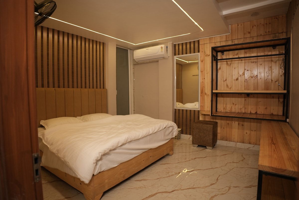 This beautifully designed room captures the essence of a Jaipurya theme,blending royal charm with modern comfort. Soft beige walls paired with golden accents reflect the warmth and elegance of Rajasthan interiors. Traditional Jaipuri artwork and carved wooden decor add an authentic
