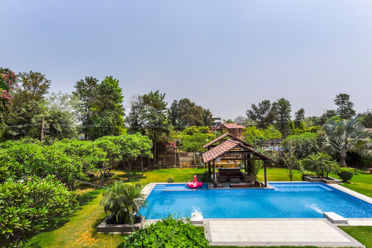 遠離城市喧囂,在 Casa Serene 盡情放鬆——這是一間私人豪華農舍,距離德里僅 1.5 小時車程。 這間旅居設有閃亮的泳池、優雅的英式涼亭,以及佔地8,000平方呎的開放式草地,非常適合在週末放鬆身心、在日落時分聚會,以及慶祝特別時刻。 Casa Serene 設有 3 間溫馨的睡房,提供戶外遊戲設施,並享有寧靜的鄉村景觀,是家庭度假、與朋友一起享受私人泳池、浪漫假期或在露天舉行私密慶祝活動的理想之選。