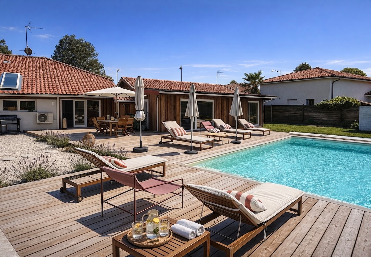 Maison entièrement rénovée avec piscine chauffée, à 10km des plages d’Hossegor. Pensée pour des séjours entre amis ou en famille, elle offre de grands espaces lumineux, 4 chambres (7 couchages) et une terrasse idéale pour profiter du soleil. Piscine, transats, coin repas extérieur : tout est réuni pour vivre dedans-dehors du matin au soir. La maison dispose également d’une salle de sport rare dans la région. Au calme, tout en étant proche des plages, restaurants et pistes cyclables.