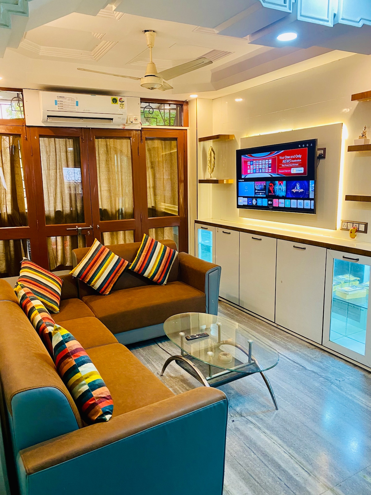 CLEAN AND SANITISED, 3 BHK, 2500 SQ FT., FULLY AIR CONDITIONED, FREE UNLIMITED WI-FI, FREE PRIVATE PARKING, LUXURIOUS YET HOMELY APARTMENT IN A WELL CONNECTED NEIGHBOURHOOD FOR A COMFORTABLE LIVING. Conveniently located in a beautiful, green, quiet and posh locality, with easy access to public transport, restaurants & cafes, grocery shops, markets, pharmacies, ATMs, salons, etc., this huge, modern, secured apartment on the ground floor is very bright, airy and spacious.