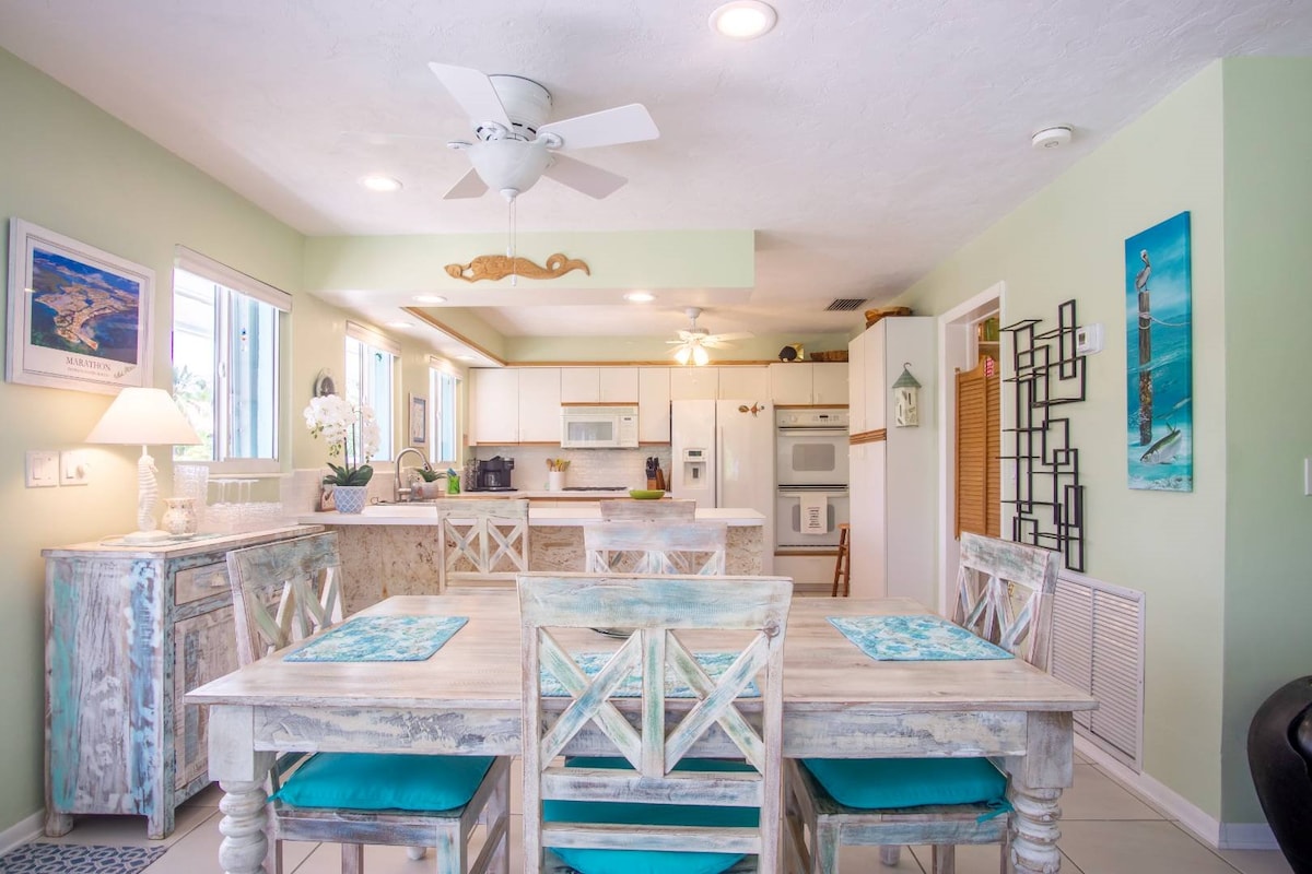 更新的海濱2BR/2BA ,配有特大床主臥室、第二間臥室配有大床和拉出式梳化。35英尺海堤—帶上你的船! 享受配備不鏽鋼電器的全套石英廚房。 位於Venture Out ,一個安靜、適合家庭入住的度假村,設有釣魚、龍蝦、泳池、熱水浴缸、醃黃瓜球、網球、籃球、娛樂中心、單車、皮艇和SUP。 在基韋斯特(20英里)和馬拉松之間。 免費WiFi ;兩間臥室和客廳均設有Roku電視。 皮艇、立式槳板和儲物區,配有額外的冰箱和誘餌冷凍庫。