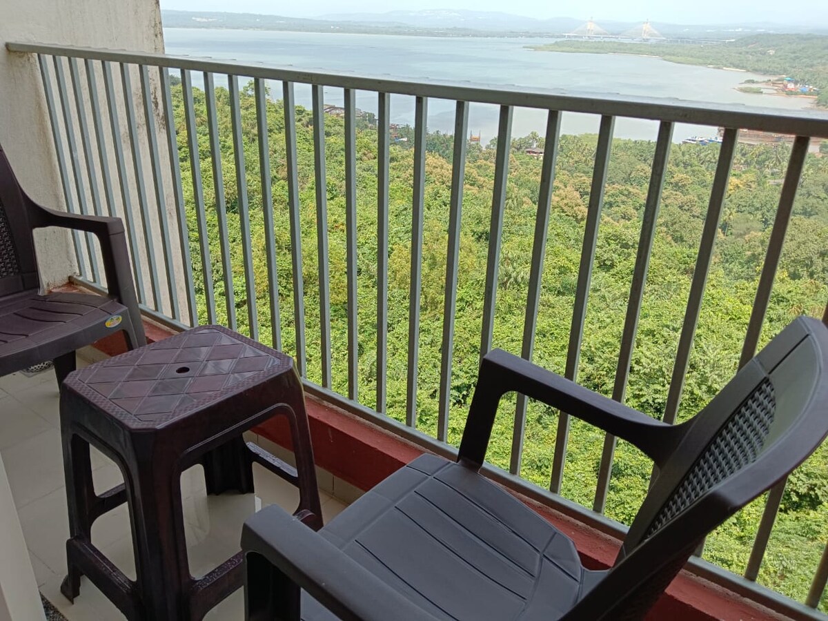 Two AC bedroom holiday home sits atop the Dabolim cliff, providing a great view of the river mouth from all rooms. This hidden gem boasts of spacious balconies to enjoy the sunrise - or sunset :) 5 minutes to the airport! Panjim or South goa is 30 mins by car Well furnished and has fully functional kitchen , RO, Microwave etc n wash/mac AC Living room with Smart TV. Access main full length pool , sauna bath, gym,squash, pool table and so on. Infinity pool swimming is restricted.
