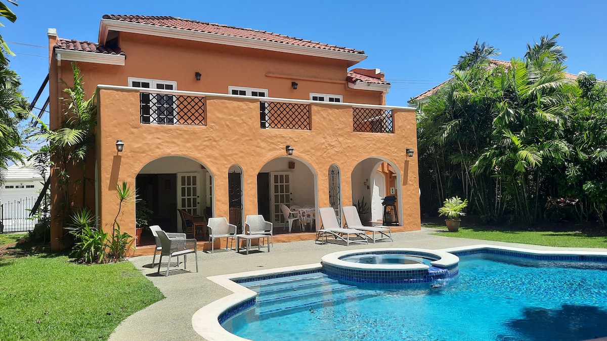 Casa Bon提供你在加勒比度假屋所需的一切舒適! 它位於Bon Accord區,地理位置方便,步行即可抵達多巴哥最受歡迎的兩個海灘Store Bay和Pigeon Point。 這間迷人的西班牙風格別墅坐落在茂密的熱帶花園中,設有四間冷氣睡房,其中三間設有套房浴室。 開放式客廳和餐廳直接通往露台和泳池甲板,配有免費泳池和附帶的水療中心。