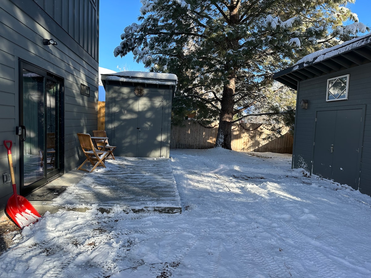 Enjoy the local's vibe in a friendly and convenient neighborhood that is close to downtown (6 blocks), trails and river. Relax in our peaceful and bright studio. This is a large contemporary space with an open living area and a comfortable queen-size bed with an Avocado mattress (medium/firm). There are big windows that look out to a private patio amongst pine trees. The patio is a great spot to star-gaze and soak up the sun. There is a storage shed on the patio that you can use for your gear.