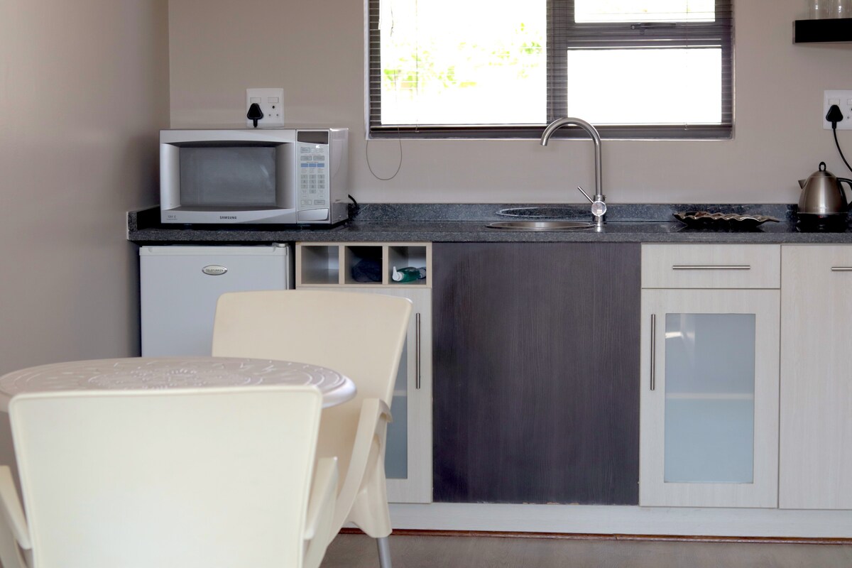 距離Rosepark醫院600米以內的寧靜住宿。 距離房源2公裏內有2個超市。 附近有許多快餐地點。 可供1人入住/2人( 1張雙人牀) 1間帶套房浴室的臥室。 小廚房配備微波爐和迷你冰箱。 所有普通廚房電器炊具,以及陶具和刀具。 有提供牀單。 提供WiFi和Dstv。 2輛車的停車場。
