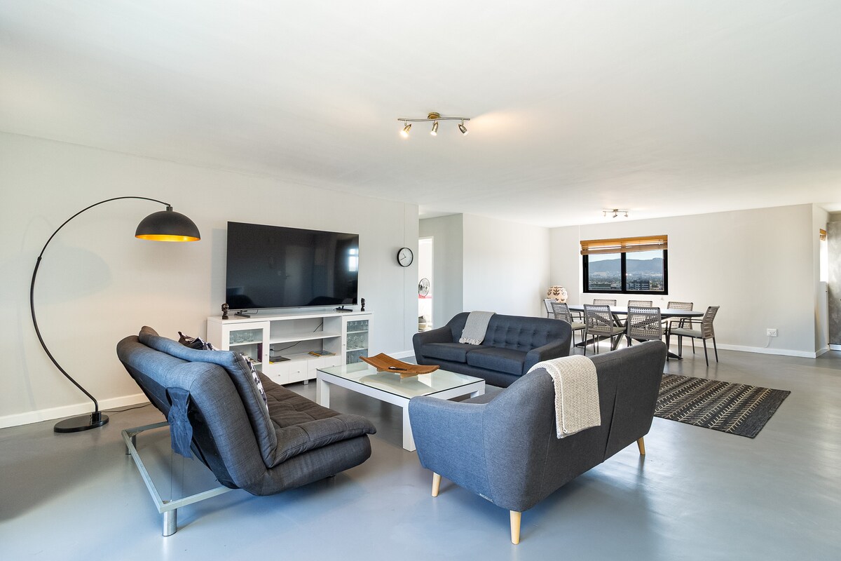 頂樓角落公寓,可欣賞桌山的壯麗景色。 寬敞的起居空間,通往私人陽台。兩間寬敞的臥室,每間都有自己的全套浴室。 從舒適的床上醒來,欣賞纜車爬上桌山的景象。第二間臥室可俯瞰寧靜的鳥類保護區 Intaka Island。 為了娛樂,公寓配備了DSTV Premium和Netflix。