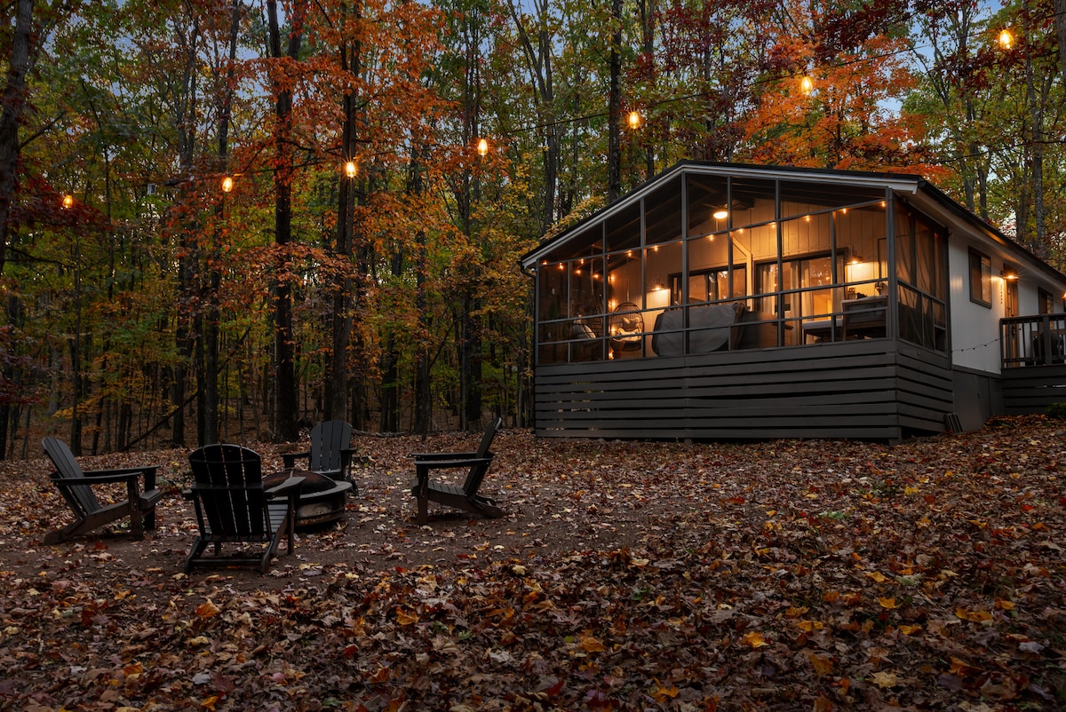 在這間新翻修的小木屋中,充分享受西維吉尼亞州的野趣和奇妙之處,距離伯克利泉市中心20分鐘。從寬敞的前門廊欣賞樹林景觀,在石頭火坑周圍製作棉花糖,在封閉的日光房中浸泡在熱水浴缸中,在燃木爐前捲起一本書,並在電影院般的閣樓中享受舒適。您可以使用私人湖泊和令人驚嘆的徒步小徑,距離小木屋幾分鐘路程。