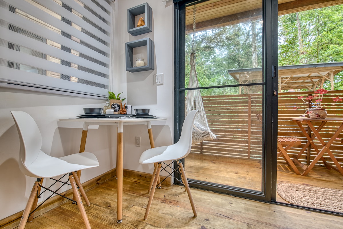 This modern style tiny home is located a beautiful jungle settings. Enjoy monkeys and birds from the comfort of your luxurious king size bed, sofa couch, or twin beds in our vaulted loft viewing and sleeping area. Escape the heat and bugs with our AC cooled indoor area. A screened kitchen with appliances to prepare almost any meal. And a great bathroom with private outdoor shower to truly enjoy nature. We have games, books, and a smart tv to keep you busy on those rainy days. Enjoy!