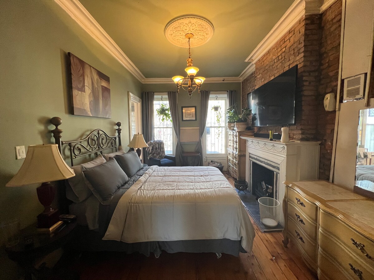 One of Park Slopes best locations. Newly renovated cozy suite in our home . Shared entrance to second floor suite as pictured, with working fireplace, outside furnished large deck with pleasant view, and a dreamy bed. Lockable bedroom and full apartment .Close to most subway trains and buses, easy access to Manhattan and local features including Prospect Park, Barclay Center, all museums, and features great shopping and dining for all of your tastes. There are stairs to get to the unit.