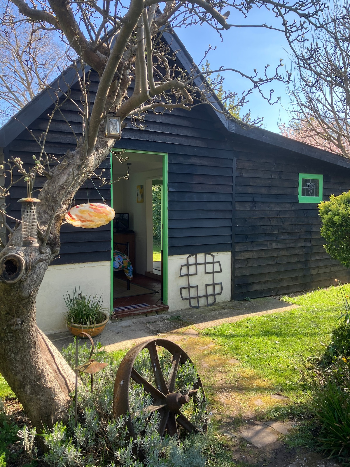 Nestled in the village of Amberley at the foot of the Downs. The hand-built, eco-friendly wood cabin is in the shaded, far corner of the 1 acre plot, facing south towards downland, across fields and a small pond where water birds gather. The cabin is full of rustic charm. It is a completely secluded and tranquil place, ideal for nature lovers and those seeking a short-term escape from the hassle and bustle of city life. It provides a perfect retreat for writers or artists.