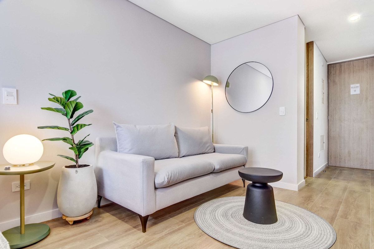 Welcome to your perfect city getaway! - Modern loft (29.31 m2) with warm and tranquil ambiance. - One bedroom featuring a comfortable double bed. - Private bathroom with hot water shower. - Fully equipped kitchen including fridge, electric stove, and microwave. - Smart TV for entertainment. - Flexible dining area, also usable as a workspace. - Prime location near the International Center, financial district, and historic Candelaria.