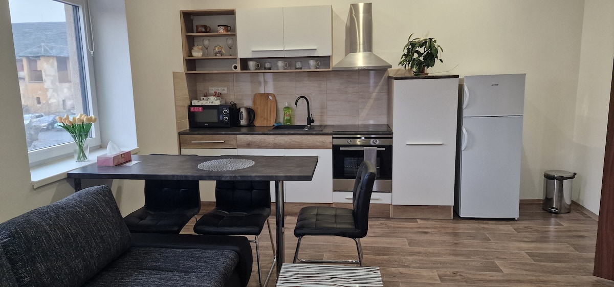 Newly renovated apartment „U Gothic twin“with an area of 37 square meters with historic vaulted ceiling is located in the very quiet historical centre of Litoměřice in the basement of the house. The apartment is fully equipped and includes a size double bed 180 x 200 cm, central heating, free Wi-Fi, TV Smart screen connected to the Internet + PC connection (HDMI,USB), dining table, comfortable sofa. Kitchen is fully equipped. Small bathroom with shower and toilet with an area of 1.5 sq.m.