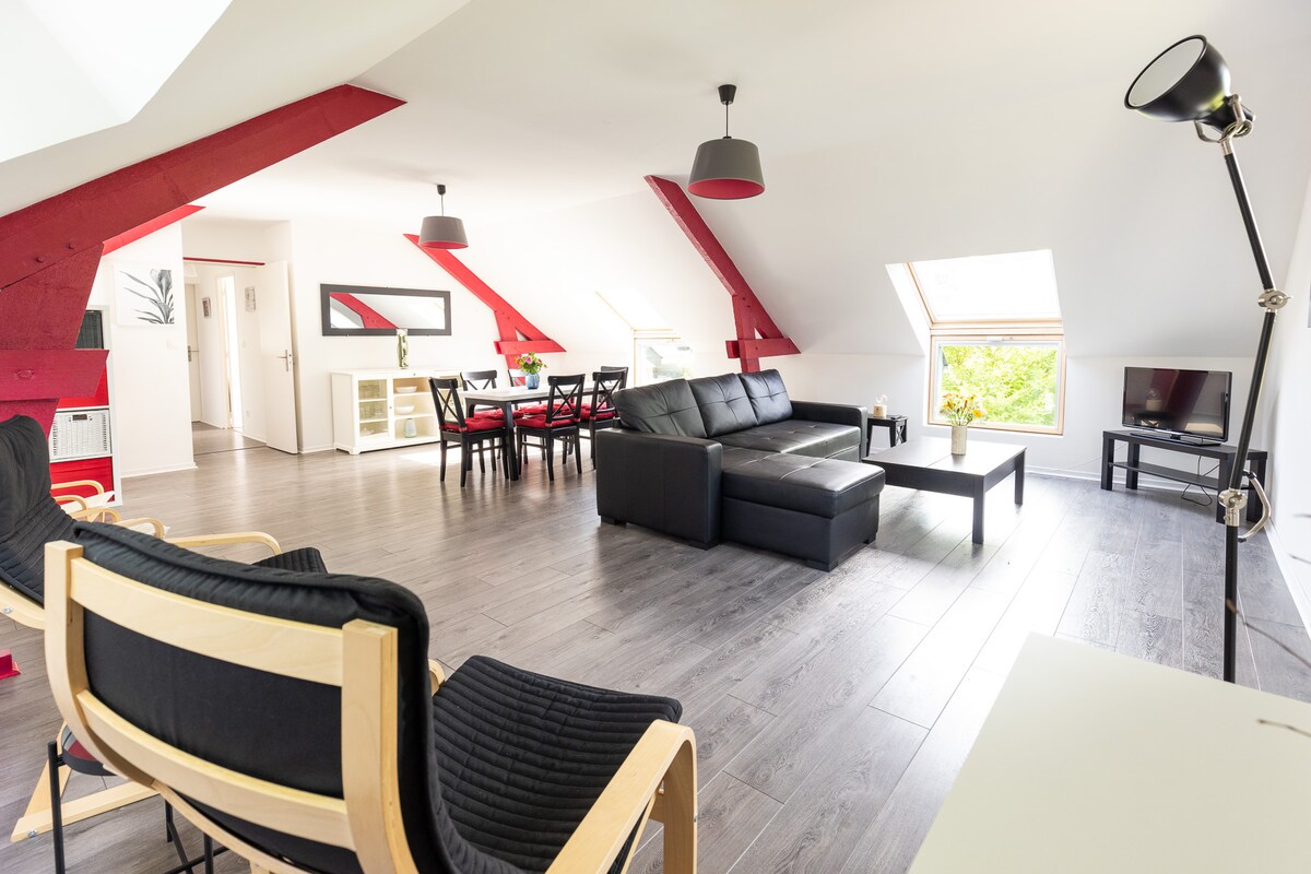 Venez profiter d'un séjour au calme et dans la verdure dans notre grand appartement meublé de 95m2 situé au 1er étage au milieu d'un parc paysagé et arboré. Appartement lumineux avec une grande pièce de vie agréable. Vous serez à proximité d'un parc avec nos poules pour pouvoir avoir des oeufs frais tous les matins. Celles-ci seront placées sous la bonne garde de notre chien, qui monte la garde dans son espace clos, sans aucun danger pour vous.