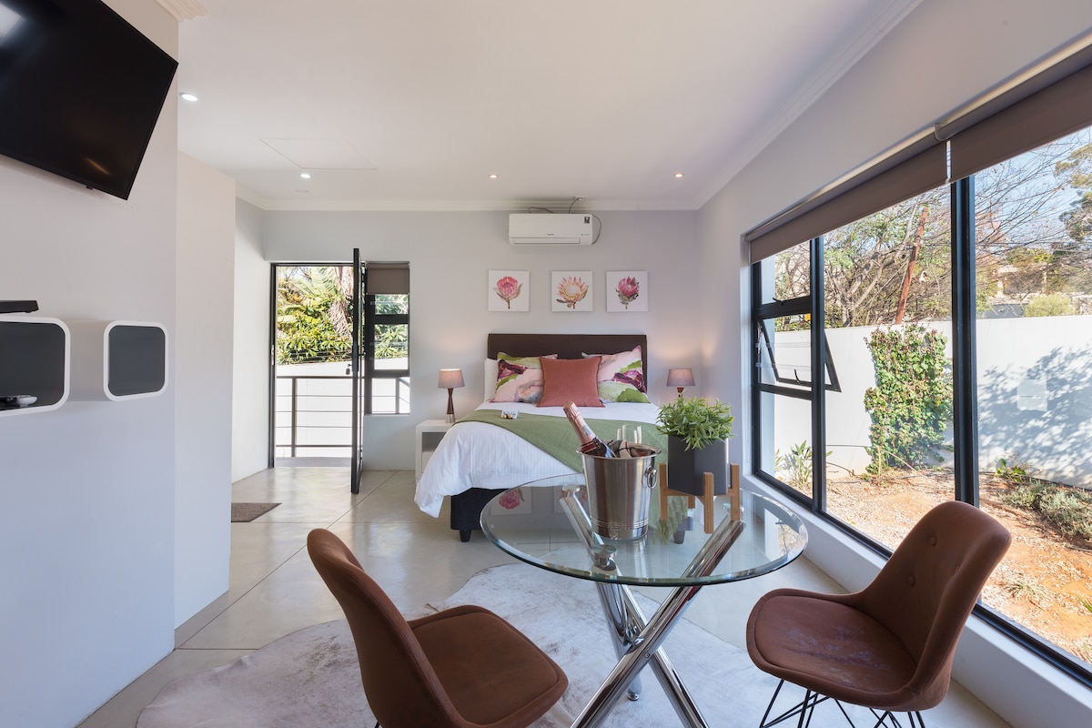 這間陽光明媚的一樓公寓位於綠樹成蔭的赫林漢姆( Hurlingham ) ,保持溫暖。 我們有完全離網供水! 我們明亮的公寓適合在桑頓工作的高管或前往桑頓的遊客。 我們的房源有過濾井水,非常安全,配有警報系統、橫樑、電柵欄、閉路電視和武裝反應。 房源是獨立的,可俯瞰花園。 超高速光纖網路@ 20mb。 乘坐Uber只需5分鐘即可抵達Sandton。 1輛車的安全停車位。