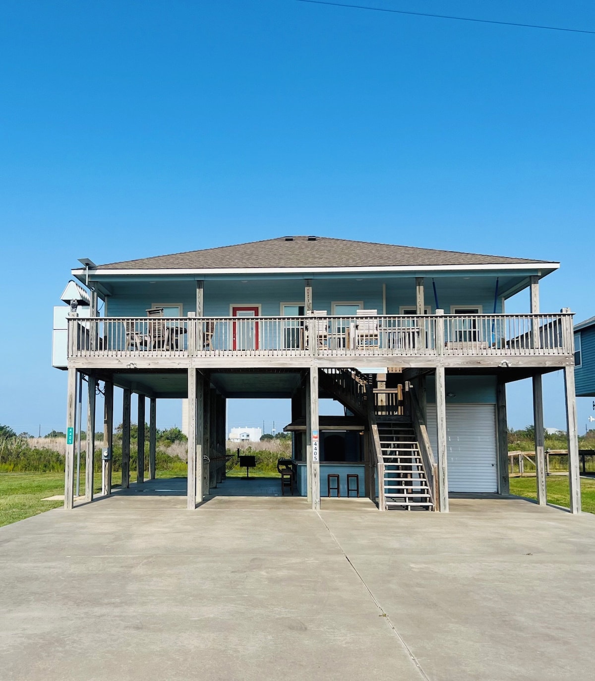 Beaches & Dreams Beach House, Crystal Beach (Near Galveston) ~ 7 person PLUNGE pool* w/ hot tub option ~ Sleeps 14 ~ 5 min walk to the beach or drive to park directly on the sand ~ Fireworks/Bonfires OK @ the Beach** ~ Backyard Fun: CANAL FISHING + Tiki Bar + TV + Charcoal Grill ~ 2 balconies to enjoy sunrise views & the ocean breeze (obstructed ocean views) *Plunge Pool Min Temp = 80F **Check Galveston County website for restrictions/bans