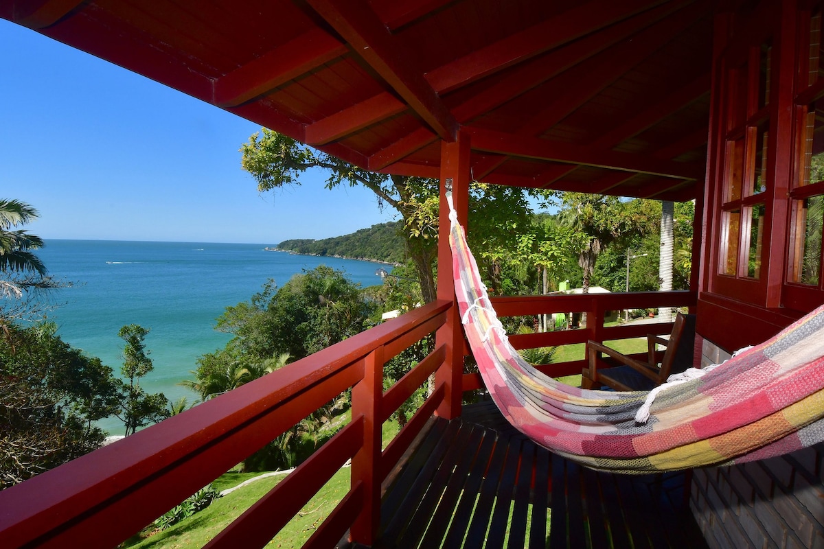 度假木屋距離Bombinhas海灘200米,中間區的房間,配有雙人牀、智慧電視、空調。 在較低的樓層設備齊全的廚房、雙人牀和浴室。 WiFi和燒烤。 我們提供1把雨傘和2把沙灘椅。 樹木地形,安靜的地方。