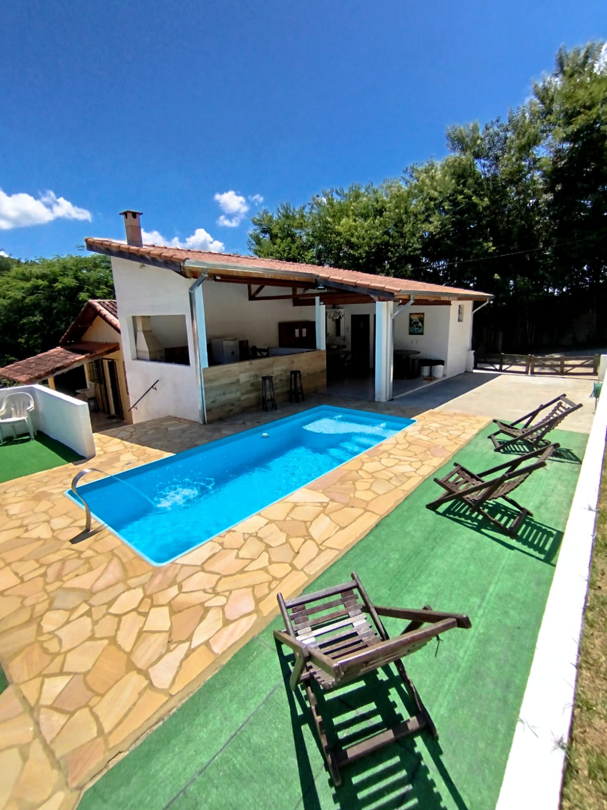 xale rústico com acomodação interna e externa confortavel. suíte com banheira no andar superior muito espaçosa com cama de casal e cama solteiro além de sacadas para o horizonte. ambiente social interno com sala cozinha americana com lareira e banheiro social e área de serviço com máquina de lavar. ambiente social externo com cozinha caipira e piscina. Wi-Fi para entretenimento e home ofice local sereno e tranquilo.