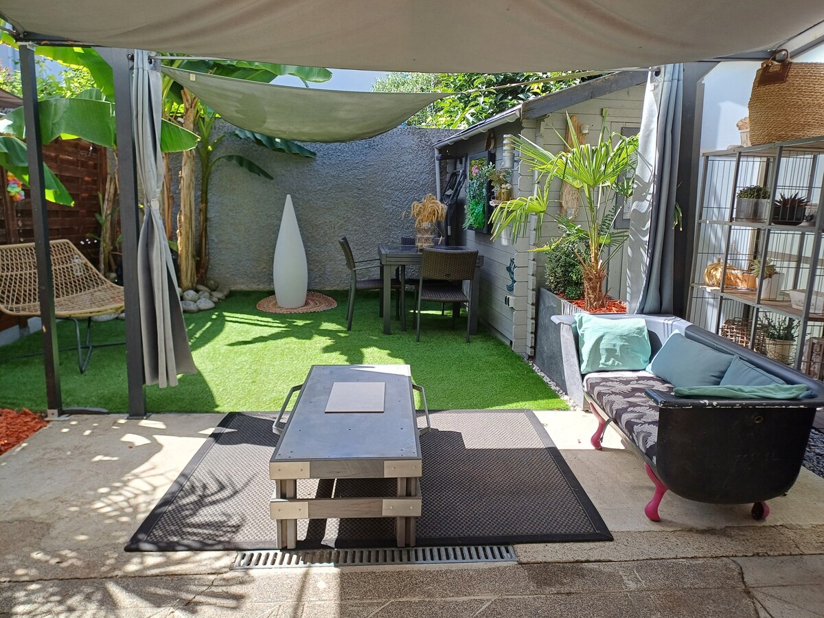 歡迎回家! 我們的房子有一個附屬建築(50 平方公尺),專門為您提供真正的放鬆時刻!獨立入口,附設 18 平方公尺的私人露台、花園休息室、烤肉架,讓您與家人或朋友共享美好時光。 裝潢高雅,您可以使用開放式的客廳廚房,樓上有 2 間臥室,配有浴室和廁所。 此住所位於我們主屋的內院,是典型的比古爾當房屋。