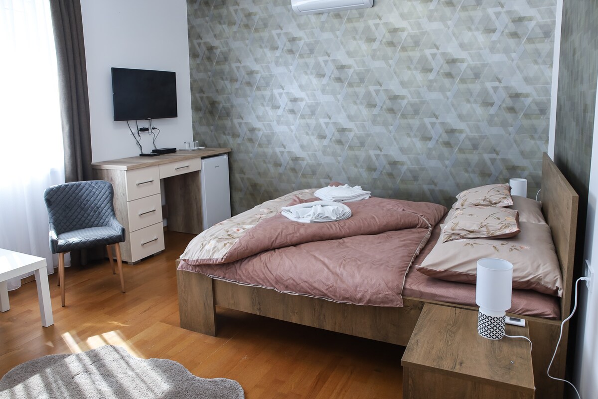 全新翻新的豪華公寓,配有客廳、美式廚房、陽臺、獨立經典浴室、優雅的臥室和寬敞的陽臺。 公寓的設備齊全,包括旅客的物品,如高級飯店。 位於Miskolc中部,位於地標性Macropolis建築中。