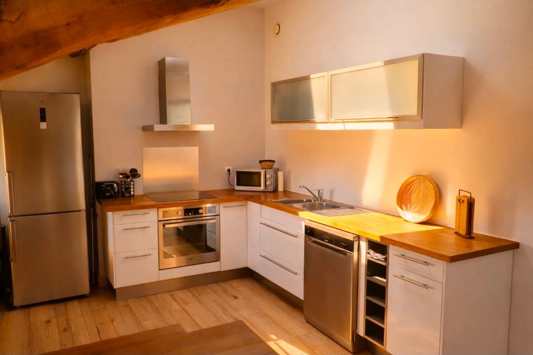 位於房屋樓上的一室一廳公寓。位於 Dombes 的一個小村莊,對面有一家餐廳。 主房配有設備齊全的廚房(洗碗機、烤箱、冰箱、煤氣爐、微波爐等),以及帶沙發的電視區。一間浴室,配有 120x80 公分的大淋浴間,配有洗衣機。 一間大臥室,配有雙人床和儲物空間。 暖氣和冷暖空調。 露臺配有家具。 停車位。