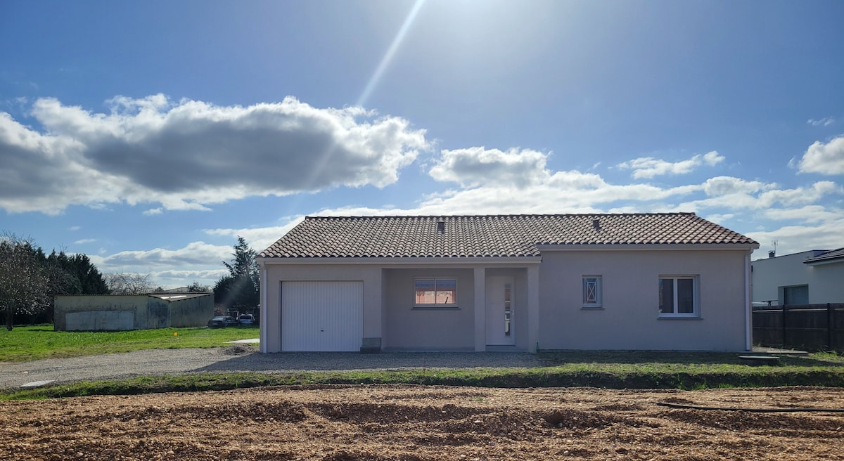 96 平方公尺的新建一層房屋,位於安靜的住宅區,靠近弗龍通市中心和所有便利設施。 明亮舒適,非常適合與家人或朋友入住,也適合商務差旅。 此房源為 3 星級,可容納 6 人,若使用沙發床,最多可容納 8 人。 500 平方公尺的私人花園正在建設中,以及圍欄、戶外露臺、房子前面的停車位。