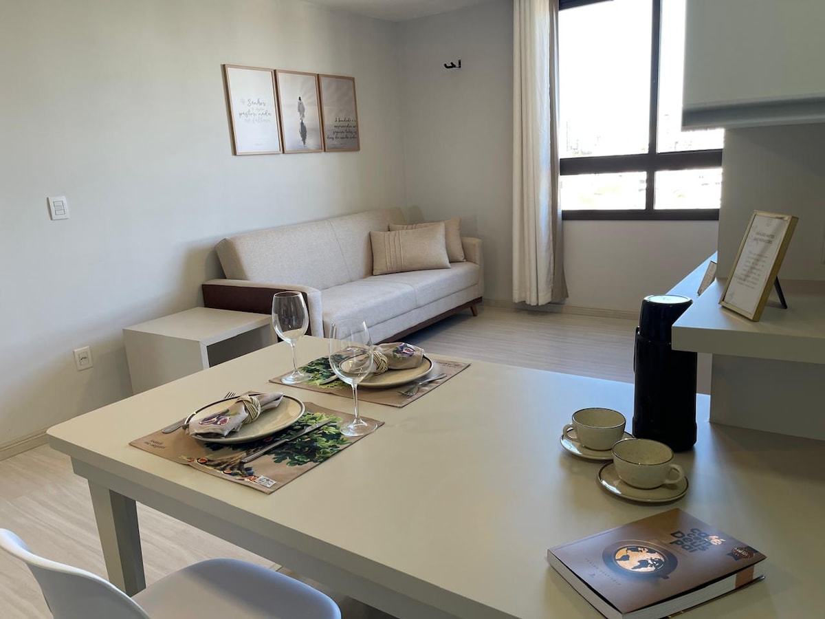在這個地理位置優越的空間享受獨特的體驗。 Lava e Seca -牀上用品和浴巾 -帶按摩器的枕頭牀墊 -電烤箱 -微波爐 -淨水器 - Wi-Fi 400mb - 55英寸智能電視,配備FireTV -吟唱工作 -沙發牀 Caxias do Sul的最佳位置,就在Pátio da Estação前面。 靠近Caxiense夜生活、夜總會、酒吧、餐廳、大學、波旁購物中心和生態博覽會。 車房。 大樓有攝像頭監控。