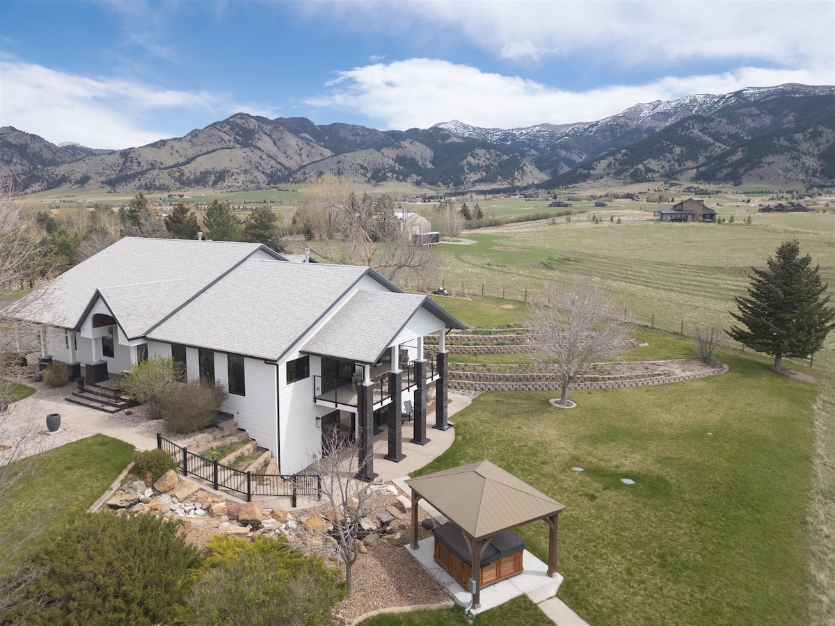 全新房源!全年獨立綠洲,高端西部風情。4間臥室、3.5間浴室、按摩浴池、面積和天堂谷的山景。 距離奇科溫泉、黃石國家公園和利文斯頓(Livingston)幾分鐘路程。理想的位置!