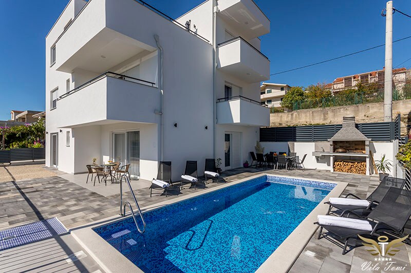 豪華公寓,可使用溫水泳池,從4月初到10月下旬都有水。 泳池配備強大的逆流系統,讓您無需碰觸牆壁即可無限遊泳。 如果兩間公寓(東部和西部)都已出租,整套房子和泳池都只供您的團體使用(最多12人)。 從泳池周圍的露台欣賞美麗的海景。