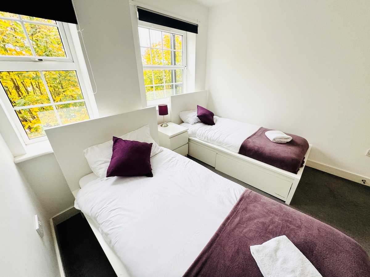 在這個平靜時尚的空間放鬆身心。 這是為您自己或與朋友預訂的整套公寓,有2間臥室,一間有套房,還有一個寬敞的起居區域,也可以是一間配有加大雙人沙發牀的額外臥室,獨立廚房還有帶浴缸或淋浴間的浴室,烹飪晚餐時如果需要,有工作空間,步行3分鐘即可抵達停車場,我們靠近AirBus、Rolls Royce、YTL、GKN等雙向有餐廳可供步行,巴士路線所有區域2分鐘