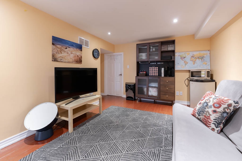 享受舒適明亮的2間臥室地下室公寓,設有獨立入口。 配備全套廚房、電壁爐、電視、免費WiFi和專用停車位。 一間睡房設有雙人床,另一間則設有拉出式床。 適合一家大細、安靜、新裝修。 步行5分鐘即可抵達雜貨店、藥店、公園和美食店。步行10分鐘即可抵達24小時營業的加油站和便利店。開車10分鐘即可抵達Go站。 可應要求提供EV充電器。 短期或長期住宿的理想選擇!