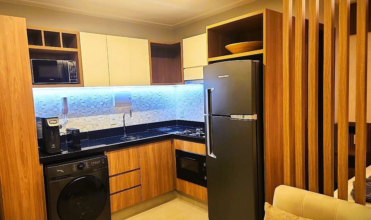 LINDO FLAT MOLILHADO (44 平方公尺): - 建築設計; - 空調; - 浴室; -陽台; - 配有櫥櫃、檯面、冰箱和微波爐的廚房; - 電視、沙發、桌子和架子; - 配有雙人床(女王尺寸)和衣櫃的臥室; - 浴室配有內置衣櫃、鏡子和淋浴間; -洗衣房。 休閒區: - 泳池; - 桑拿; -健身體健身房; - 壁球場。 地理位置優越:位於巴西利亞最好的購物中心、機場、州際公車站和地鐵站前。 24 小時酒店服務。