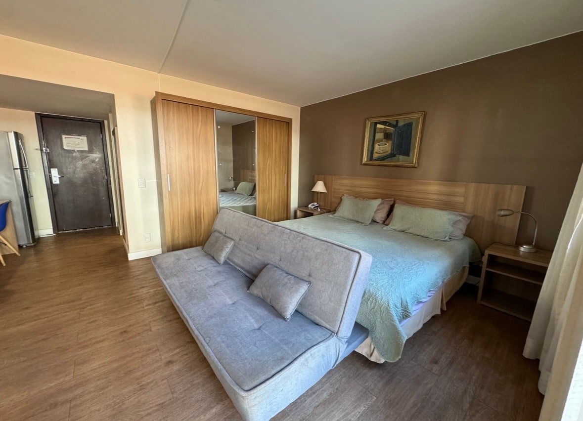 Belo flat no Garvey Park Hotel. 1 cama de casal e 1 cama de solteiro, banheiro, smart tv, geladeira, micro-ondas, ar condicionado, enxoval completo e wi-fi. Localizado no centro de Brasília, a poucos metros de restaurantes e shoppings. Curta distância da Esplanada dos Ministérios e demais pontos turísticos da cidade. Prédio entrou recentemente em reformas e a piscina está fechada.
