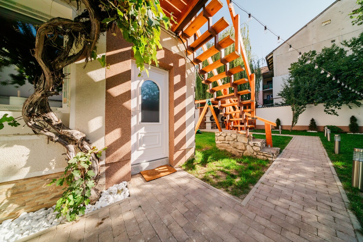 Un apartament generos, cu un design deosebit, localizat într-o zonă liniștită la parterul unei case cu o arhitectură premiată internațional, care garantează o ședere plăcută în minunatul oraș Brașov. Oaspeții beneficiază de acces separat, self check-in și o curte englezească cu acces exclusiv. Ideal pentru familii și grupuri de prieteni.