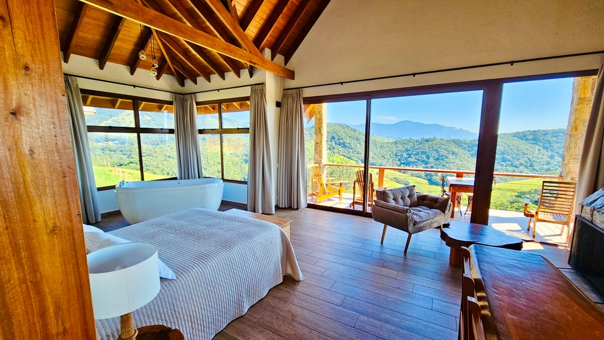 Recanto do Vale小屋正是你和你的愛人所需要的,每個細節都經過設計,讓你度過美好的日子和難忘的時刻。 因為它是全封閉的玻璃,所以在下雨和刮風的寒冷日子,您可以在極度安靜的地方享受加熱的漩渦,欣賞山景,享受完全的舒適 您還可以享受公共區域,我們有一個鯉魚池和牧場,可以欣賞景色。