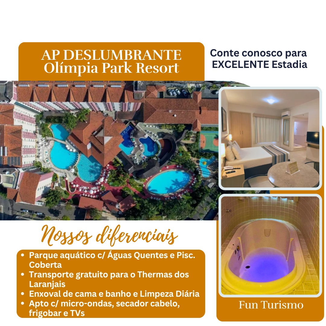 公寓位於Enjoy Olímpia公園度假村度假村內。 它距離著名的Thermas dos Laranjais 100米,距離熱海灘水上公園僅幾分鐘車程,這是一個較少嗡嗡聲的公園,但品質很多。 度假村有健身房、電影院、商店、停車場、幾個加熱泳池和兒童泳池,以及遊樂場和遊戲室餐廳(提供早餐,但不包含在內)。