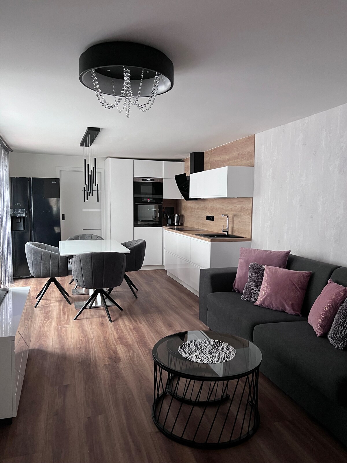 新建的2 + kk公寓,位於城市的安靜區域,配有露臺、Wi-Fi、停車位和可上鎖的自行車棚。 從住宿處步行20分鐘即可抵達市中心。 最多可容納4人。 公寓一樓設有配備冰箱、電磁爐、咖啡機和洗碗碟機的廚房。樓上有一間客廳,配有沙發床和一間雙人床臥室,可通往露臺。 公寓附近有自行車道(60公尺)、超市(300公尺)、游泳池(350公尺)和火車站(700公尺)。
