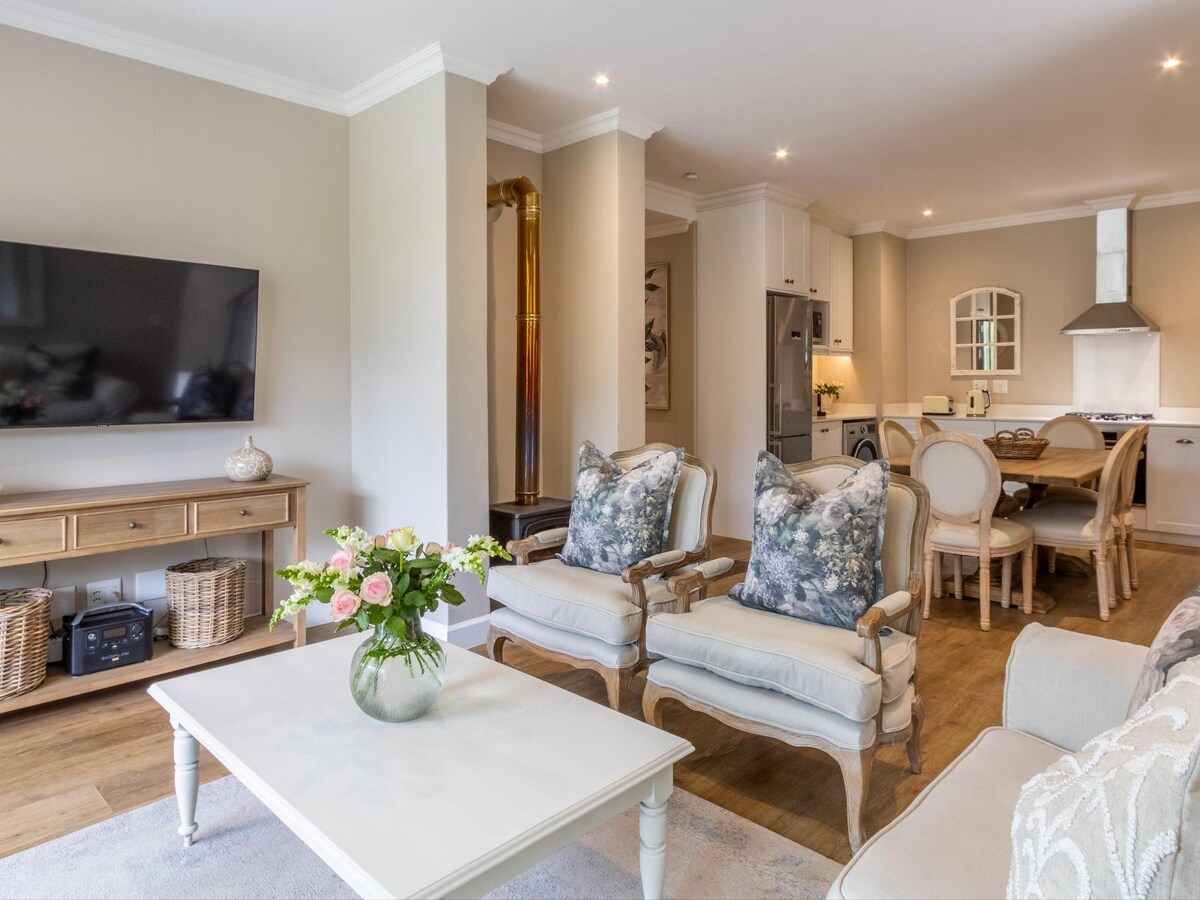 坐落在Franschhoek山脈下方的安全莊園中寬敞的兩間臥室,兩間套房。 可愛的大廚房,配有私人廚房。 空調 私人露臺/陽臺,有烤肉和山景。 可容納1或2對情侶,非常舒適。 莊園、餐廳、酒吧、水療中心有2個泳池。 從這個位於市中心的地方輕鬆前往村莊的一切。