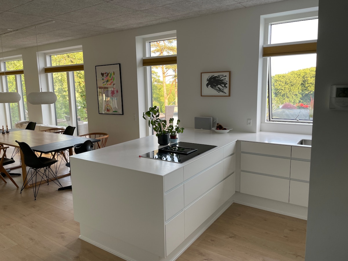 新建公寓,50 平方公尺。包括2間雙人房、小廚房、冰箱、咖啡機、迷你烤箱、單個電爐等。客廳配有沙發、用餐區和浴室/衛浴。獨立入口,停車位就在門口。位於Skamlingsbanken,距離Kolding和E45以南10分鐘車程,環境寧靜而田園詩般。 有很多機會在該地區享受大自然,大型路徑系統,景觀美麗。靠近適合兒童的 Binderup 海灘。