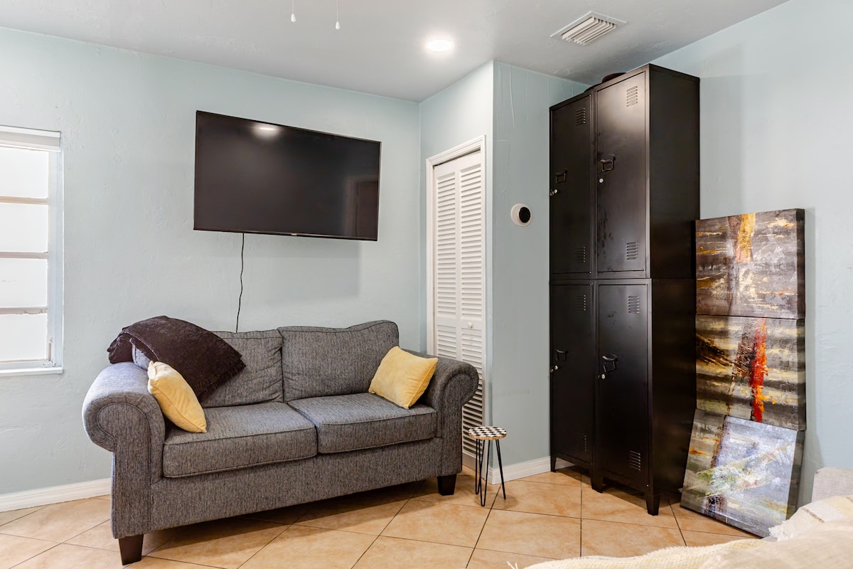 享受時尚、全新的2BR、1BA私人複式公寓,面積約900平方英尺,設計現代,開放式生活空間和全套廚房。 距離Wynwood、Design District、市中心和Brickell僅幾分鐘路程。 旅人可以獨享整個主樓層。 樓上,業主的睡房和浴室已上鎖,並且是私人的。 旅居主人經常出門旅行,可能會在旅居內,也可能不在。 如果有的話,廚房和樓上的洗衣區可能是共用的。 可容納4名成人和1名兒童。