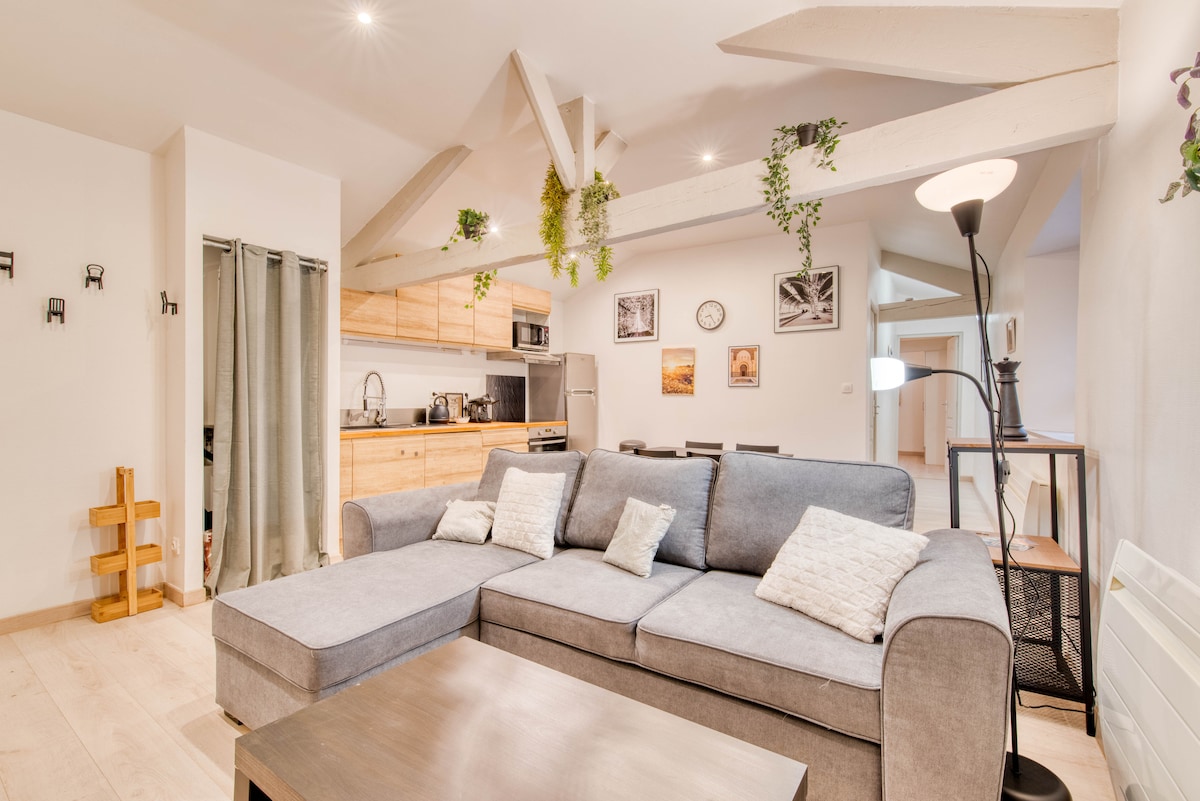 Appartement moderne et lumineux, parfait pour voyageurs et travailleurs en déplacement. Il offre une cuisine ouverte entièrement équipée, un salon confortable avec coin repas, ainsi qu'une chambre séparée pour plus d'intimité. La salle de bain dispose d'une douche à l'italienne pour un confort optimal. Situé dans un quartier calme, à proximité des commerces, cet appartement propose un cadre agréable pour un séjour pratique et reposant, que ce soit pour le travail ou les loisirs.