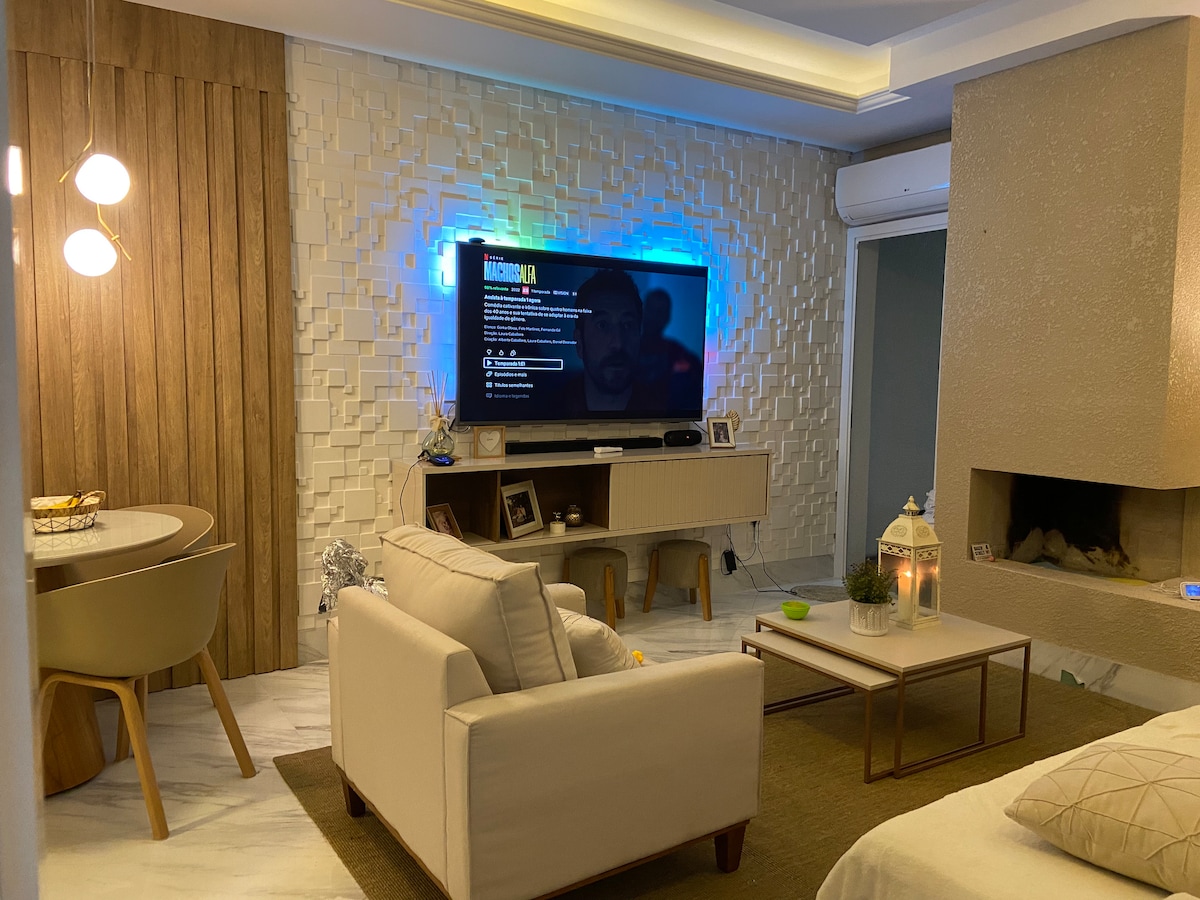 Hospede-se em um apartamento pensado com carinho para oferecer conforto e estilo. Com ar-condicionado nos quartos, cozinha completa e uma TV de 60”, sua estadia será ainda mais agradável. • Quarto 1 (suíte): Possui uma cama queen size, closet amplo e um banheiro completo com chuveiro a gás para seu conforto. • Quarto 2: Espaçoso, com uma cama de casal e espaço dedicado para home office, ideal para quem precisa trabalhar ou estudar durante a estadia. E para seu carro: garagem interna coberta!