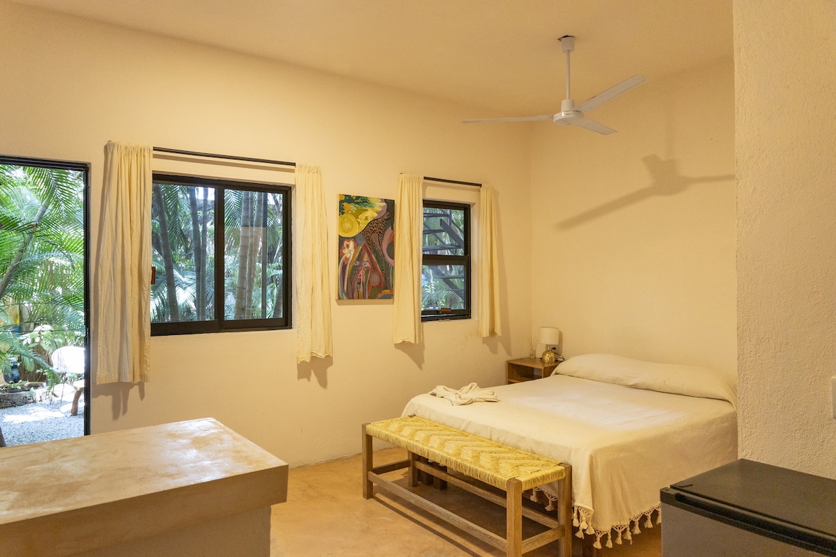 La suite está en planta alta, ofrece un espacio cómodo, fresco y tranquilo, ideal para descansar o trabajar remoto. Su diseño contemporáneo y tropical, crea una atmósfera relajante perfecta para una estancia agradable. Cuenta con cama king size, A/C, ventilador, TV, WiFi, baño privado, frigobar, cafetera Nespresso y tina. Como huésped podrás disfrutar de las áreas comunes como la alberca, camastros, mesas, cocina equipada, estacionamiento y circuito de vigilancia.