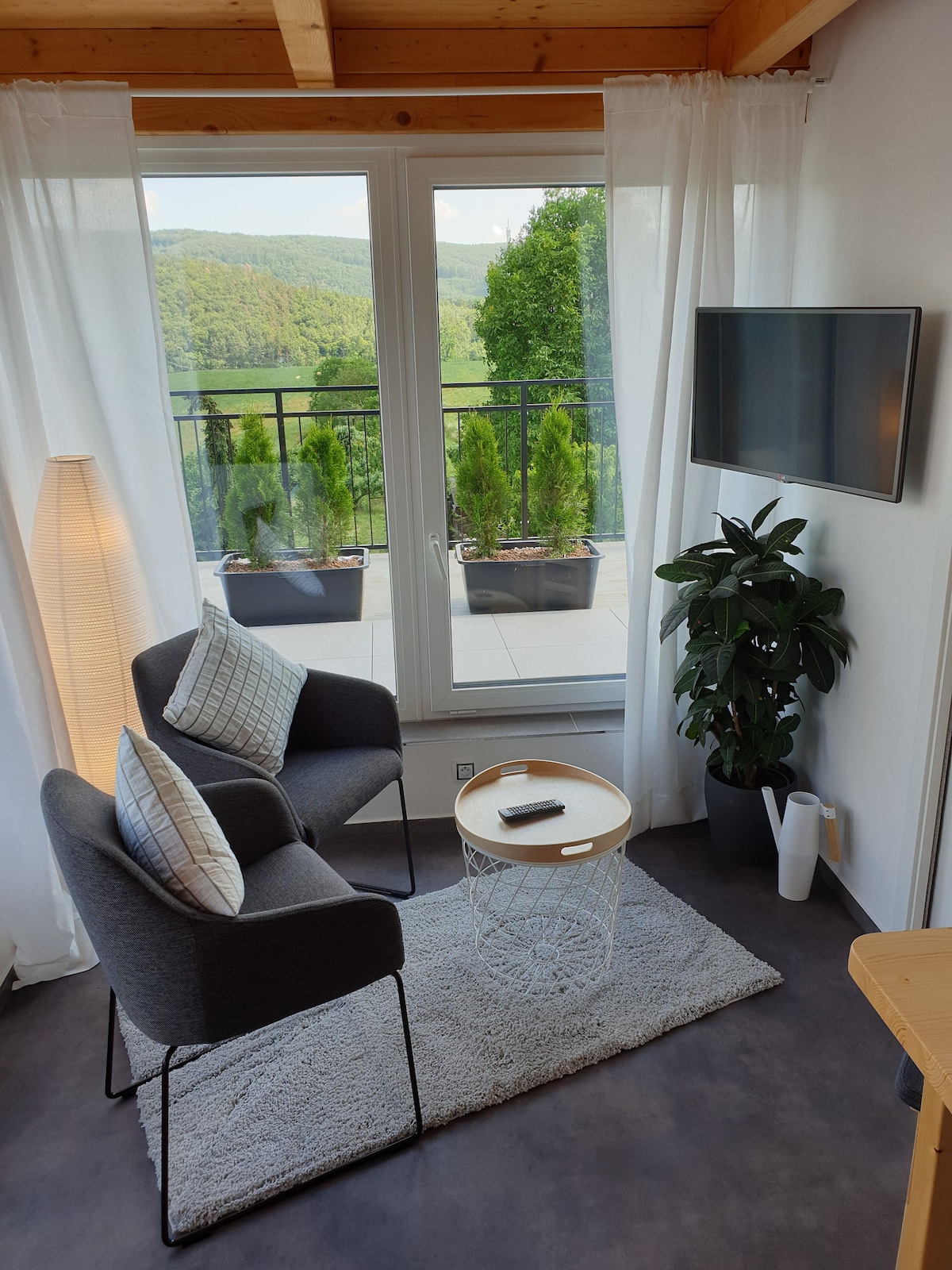 The apartment is part of a large family home which has been converted. There is a shared main entrance with one more apartment. The apartment is modern with all the amenities you would expect along with a balcony overlooking the garden with views of the forest and hills in the distance The apartment has internet via WIFI. There is also a smart TV where ONEPLAY is fully active but you can login to your Netflix or HBO account also.