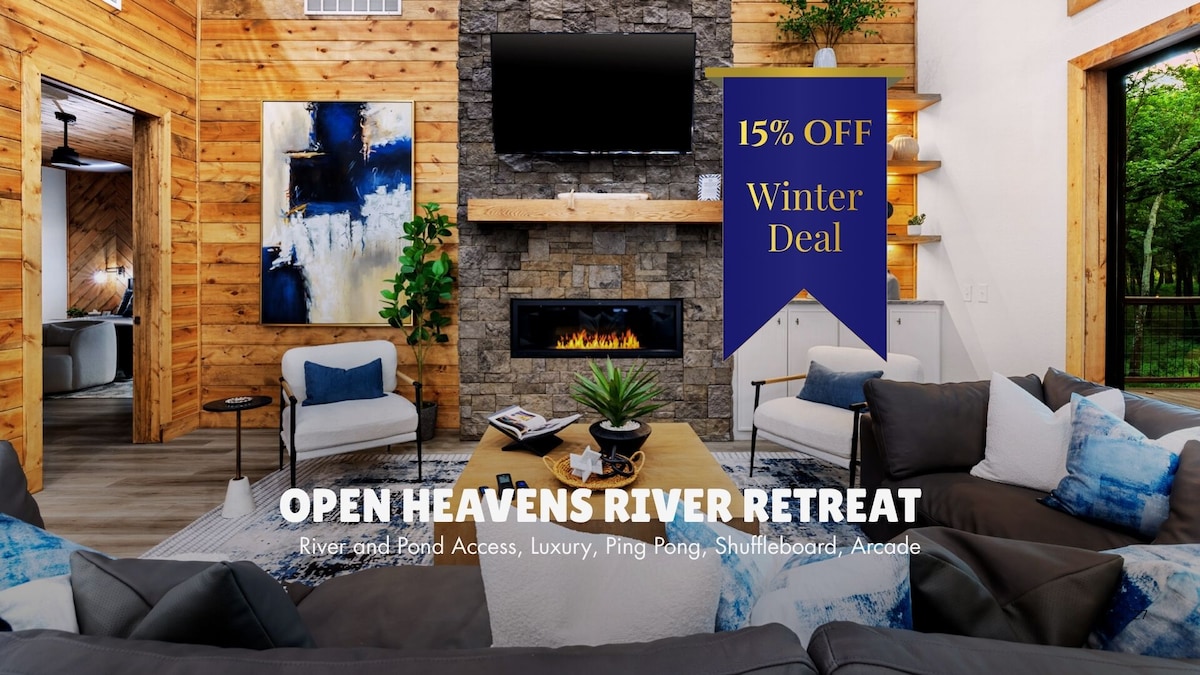 Hope Floats Lodge – We created this cabin as a place for our family to slow down, play in the river, fish before breakfast, and gather for celebrations that matter. It’s quiet, peaceful, and full of space to just be together — whether you're floating the river, grilling by the pool, or watching the kids roast marshmallows under the stars. 3 King bedrooms + bunk room | Sleeps 12 Heated pool + hot tub | Riverfront | Pet-friendly Just outside Hochatown, but a world away from busy